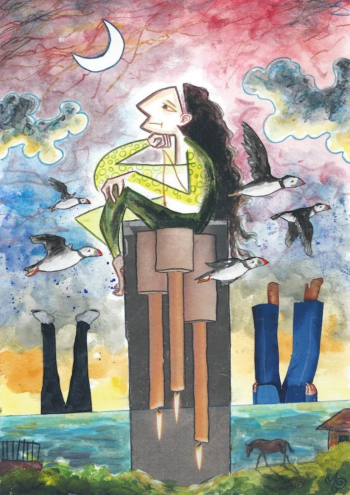 There are many unusual places to sit (while contemplating the mysteries of Being). Here are a few I recently discovered, presented in the best possible way – a mix of collage, coloured pencils and paint on nice thick paper. ENJOY!